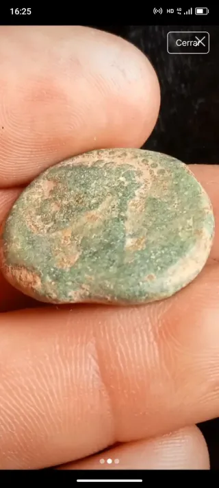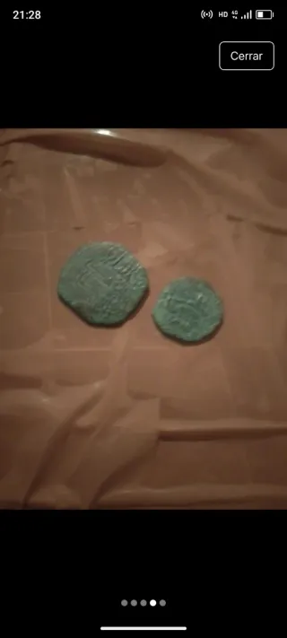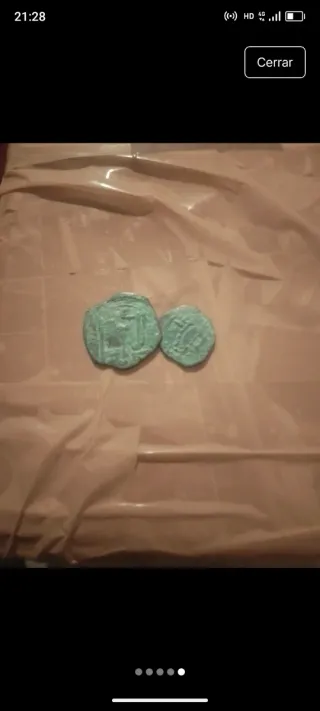 Dos monedas antiguas de origen romano. Presentan grabados distintivos. - Moneda de color verde azulado. - Diseño con relieves.