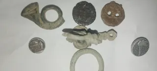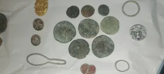 Conjunto de monedas y objetos de todas epocas mediavales y romanas - Piezas de metal con grabados. - Diversos tamaños y formas. - Aspecto antiguo y desgastado.