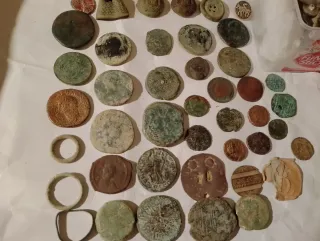 Lote variado de objetos antiguos, incluyendo monedas, botones y otros elementos.sentercios ases y bajos inperios moneda de intercanvio - Monedas de bronce y otros metales. - Botones con diseños. - Anillos y otros accesorios.