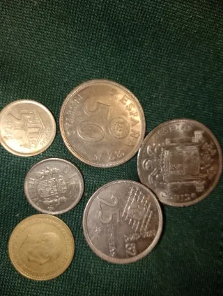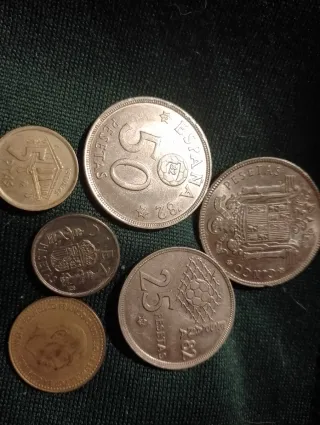 Conjunto de seis monedas antiguas de España, con diferentes valores. - Moneda de 50 Pesetas de 1982. - Moneda de 25 Pesetas de 1982. - Moneda de 5 Pesetas. - Moneda de 1 Peseta. - Moneda de 5 Pesetas. - Moneda de 1 Peseta.