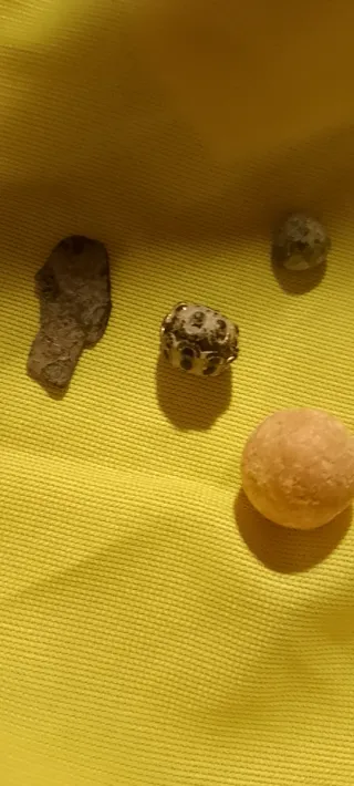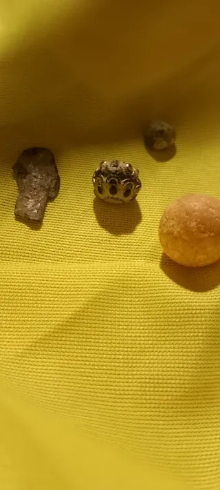 Conjunto de objetos variados de carácter antiguo. Una flecha de forma una pieza de oro una bola parese piedra y una vola de metal - Pieza con forma de cabeza. - Elemento decorativo con múltiples orificios. - Piedra redondeada de color ocre. - Pequeña piedra de tonos grises.