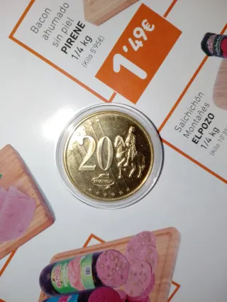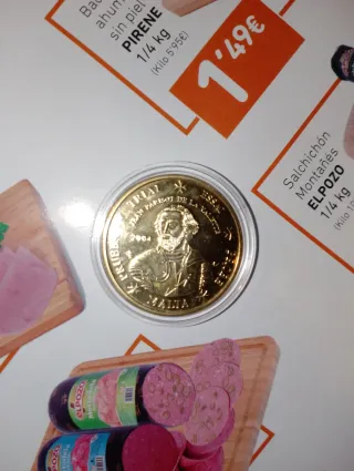 Moneda de colección con un acabado dorado brillante. Presenta inscripciones en relieve. - Diseño circular. - Material metálico.