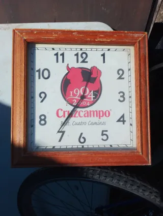 Reloj de pared conmemorativo de Cruzcampo. - Diseño cuadrado con marco de madera. - Esfera blanca con números y logo. - Incluye 1904 y 2004 en el diseño.