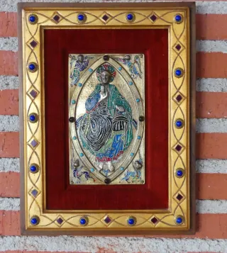 Cuadro religioso de Cristo Pantocrator con detalles en esmalte. - Obra del artista Modest Morató. - Técnica de esmalte sobre metal. - Diseño detallado con motivos ornamentales. En plata, con 12 turquesas, 4 amatistas, 14 lapislázuli talla cabujón y 14 rubíes en bruto.