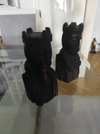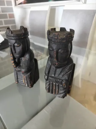Conjunto de dos figuras de madera tallada, representando a un rey y una reina. Cada pieza tiene un diseño detallado y un acabado oscuro. - Figuras de madera. - Diseño de rey y reina. - Talla detallada.