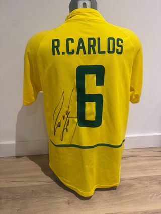 Camiseta de la selección de Brasil de la Copa del Mundo 2002, firmada por Roberto Carlos. - Color amarillo. - Número 6 en la espalda. - Firma autógrafa de Roberto Carlos.