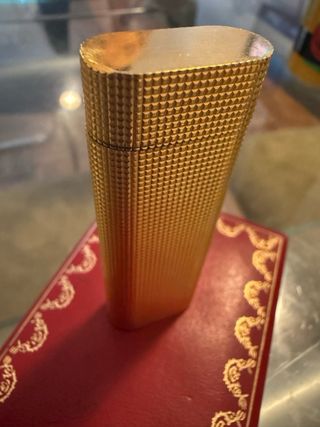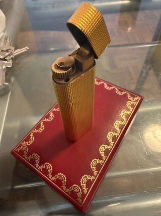Elegante mechero de coleccionista de la marca Cartier. Su diseño clásico y acabado dorado lo hacen una pieza destacada. - Acabado en color dorado. - Diseño texturizado en el cuerpo y la tapa. Bañado en oro 18 k. Es una donación.