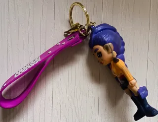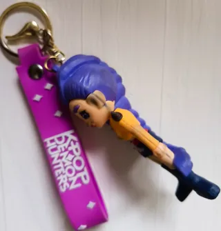 Llavero con figura de personaje de K-POP DEMONHUNTERS. - Figura de personaje con pelo morado y traje amarillo. - Correa morada con detalles blancos.