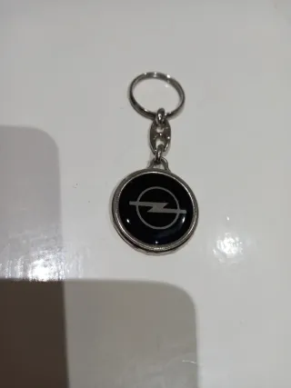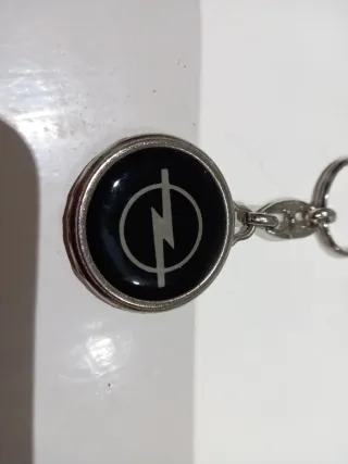 Llavero con el icónico logo de Opel, publicidad de Araguas Las Rozas - Diseño circular con borde metálico. - Fondo negro con el símbolo de Opel en plateado.