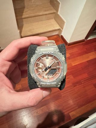 Reloj Casio G-Shock GA-2100, conocido como Casio Oak. Diseño transparente con esfera en tono cobre. - Correa y caja de resina transparente. - Esfera analógica y digital. - Resistencia al agua 20 BAR.
