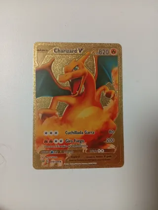 Carta Pokémon Charizard V dorada, con un diseño brillante y llamativo. - Tipo: Básico - Ataques: Cuchillada Garra (80) y Giro Fuego (200) - Debilidad: x2 - Resistencia: -30 - Ilustrador: aky CG Works - Número de carta: 019/189