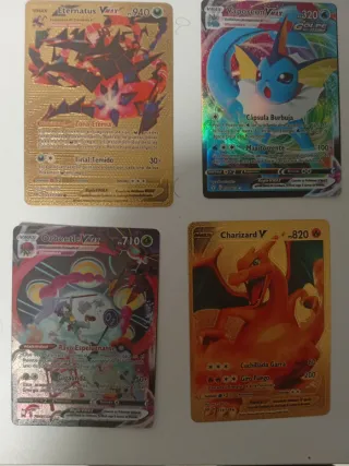 Conjunto de 4 cartas Pokémon VMAX con acabado dorado. - Eternatus VMAX - Vaporeon VMAX - Orbeetle VMAX - Charizard VMAX