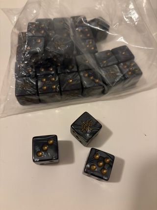 Conjunto de 30 dados originales para Warhammer 40,000, con temática de los Marines del Caos. Los dados son de color gris oscuro y negro con detalles en dorado. - Diseño inspirado en el universo Warhammer 40k. - Símbolos del Caos grabados.