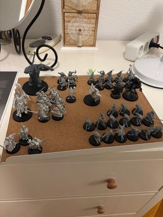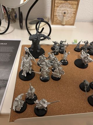 Ejército de Barad dur de el juego de estrategia El Señor de los Anillos, ESDLA. Incluye: Sauron Rey Brujo de Angmar a pie y a caballo bien pintado 3 Nazgul a pie Nazgul a caballo Orco de mordor 6 Numenoreanos negros con ecudo Chamán orco 5 orcos con escudo y 1 con espada 9 orcos con lanza 9 orcos con arma a dos manos 4 orcos con arco 10 dados personalizados de Barad dur NO negociable, NO se separa.