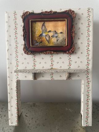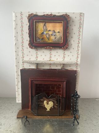 Chimenea para casa de muñecas, realizada a mano. Incluye, todo separado ver fotos. - Pared de chimenea con papel pintado y cuadro. - Chimenea con ladrillos rojos. - Pantalla protectora con gallo dorado. - Leña. - Set de herramientas para chimenea. Medidas: altura 23 cm y ancho 18 cm Hechas a mano. Años 80. Más muebles para casitas de muñecas en mi perfil.