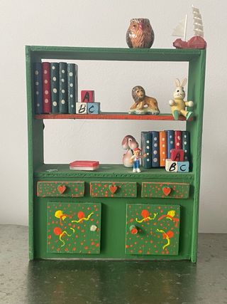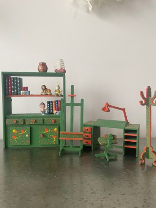 Conjunto de muebles para casa de muñecas, estilo juvenil. Hechas a mano. Años 80. Incluye: - Estantería verde con elementos decorativos. - Escritorio verde con cajones y silla a juego. - Caballete de pintura. - Perchero. Medidas estantería: altura 20 cm y ancho 15 cm Más muebles para casitas de muñecas en mi perfil.