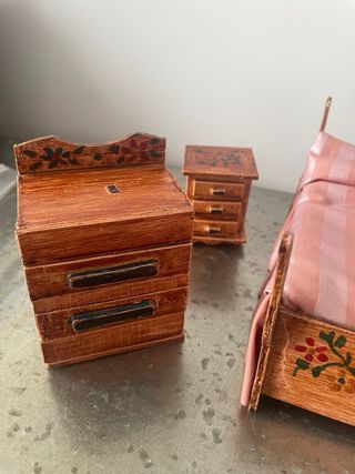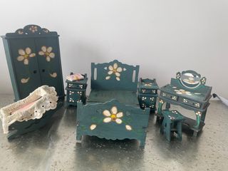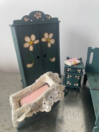 Conjunto de muebles para casita de muñecas. - Armario - Cama - Cuna - Tocador con espejo - Taburete - 2 Mesitas de noche Hechas a mano. Años 80. Medidas: ver fotos. Más muebles para casitas de muñecas en mi perfil.