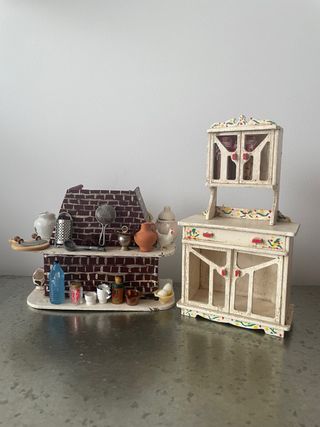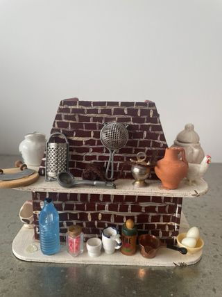 Conjunto de muebles para casita de muñecas, ideal para recrear una cocina. - Cocina de ladrillo con estantes. - Mueble alacena con puertas y cajones. - Accesorios de cocina variados. Hechas a mano. Años 80. Medidas estantería: altura 18 cm Medidas mueble: altura 12 cm Más muebles para casitas de muñecas en mi perfil.