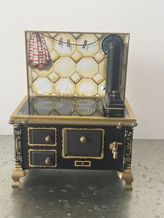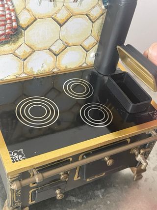 Detallada cocina de juguete, perfecta para una casa de muñecas. - Diseño clásico en color negro con detalles dorados. - Incluye hornallas, cajones y un grifo. - Fondo decorado con azulejos y tendedero. Medidas: alto 13 cm ancho 11 cm y profundidad 8 cm Más muebles para casitas de muñecas en mi perfil.