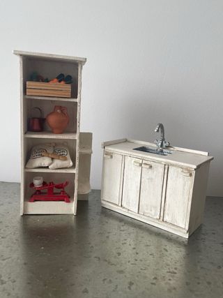 Conjunto de muebles para casita de muñecas, ideal para crear un ambiente de cocina. - Estantería alta con varios compartimentos. - Mueble bajo con puertas y fregadero. - Incluye accesorios decorativos como jarras, sacos de harina y una báscula. - 4 sillas. Hechas a mano. Años 80. Más muebles para casita de muñecas en mi perfil.