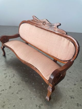 Conjunto de muebles de madera para casita de muñecas, compuesto por un sofá y dos sillas individuales. - Tapicería en color rosa pálido. - Diseño clásico y detallado. Hechas a mano. Años 80. Más muebles para casita de muñecos en mi perfil.
