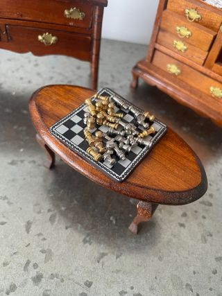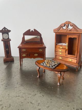 Conjunto de muebles de madera para casa de muñecas, ideal para crear un salón acogedor. - Reloj de pie - Tocador con espejo - Armario - Mesa de centro con tablero de ajedrez Hecho a mano. Años 80. Más muebles para casita de muñecas en mi perfil.