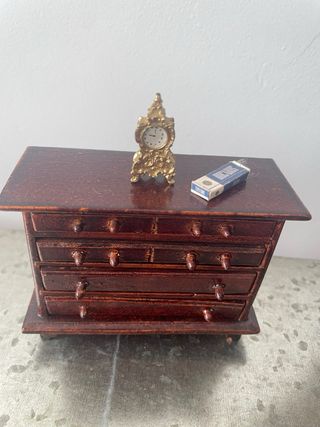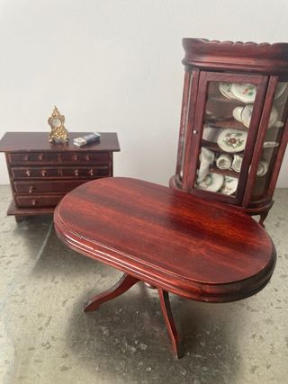 Conjunto de muebles de miniatura para casa de muñecas, ideal para coleccionistas o para decorar. - Mesa ovalada de madera oscura. - Mueble cajonera con reloj y cartón de ducados. - Vitrina de madera oscura con vajilla en el interior. Hechas a mano. Años 80. Más muebles para casita de muñecas en mi perfil.