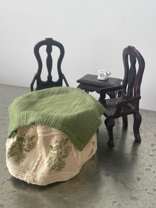 Conjunto de muebles para casa de muñecas, ideal para crear un salón acogedor. - Sillas de madera oscura con diseño clásico. - Mesa auxiliar de madera oscura. - Teléfono antiguo en miniatura. Hechas a mano. Años 80. Más muebles de casita de muñecas en mi perfil.