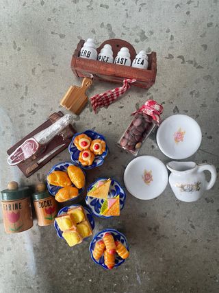 Conjunto de adornos para casita de muñecas con temática de cocina. - Estantería de madera con botes de especias (HERB, SPICE, YEAST, TEA). - Tabla de cortar de madera. - Tarros de harina y azúcar. - Jarra de leche. - Platos pequeños con motivos florales. - Frascos con frutos secos. - Variedad de miniaturas de comida: sándwiches, pasteles, croissants, bollos y salchichas. Más muebles para casita de muñecas en mi perfil.