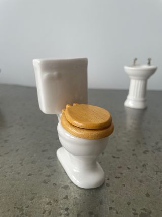 Conjunto de baño para casita de muñecas. - Bañera blanca con patas. - Lavabo blanco con pedestal. - Inodoro blanco con tapa de madera. - Soporte papel higiénico. - Espejo. Hecho a mano. Años 80. Más muebles para casitas de muñecas en mi perfil.