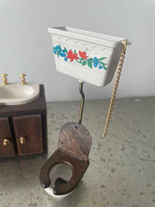 Conjunto de baño para casita de muñecas. - Mueble de baño de madera oscura. Incluye lavabo con grifo dorado y accesorios de afeitado. - Inodoro con cadena decorativa. - Toallas de colores y accesorios en estanterías. Hechas a mano. Años 80. Más muebles para casitas de muñecas en mi perfil.