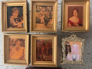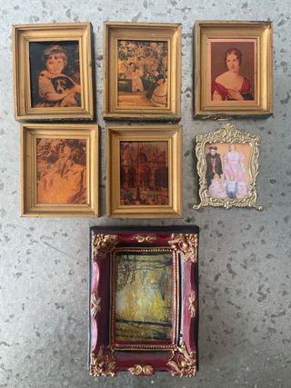 Conjunto de siete cuadros decorativos en miniatura, perfectos para casas de muñecas o coleccionismo. - Marcos dorados y ornamentados. - Variedad de escenas y retratos. Medidas en las fotos. Más muebles para casitas de muñecas en mi perfil.