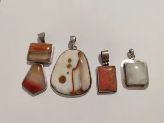 Conjunto de 4 colgantes con engastes de plata y piedras naturales de diversos colores y formas. - Colgante cuadrado con bandas naranjas y marrones. - Colgante en forma de gota con bandas naranjas y rojas. - Colgante ovalado con manchas marrones y vetas rojas. - Colgante rectangular de piedra rojiza. - Colgante cuadrado de piedra blanca iridiscente.