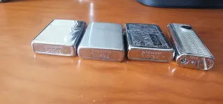 Conjunto de cuatro mecheros, tres de la marca Zippo y uno de la marca Win. - Tres mecheros Zippo plateados. - Uno de ellos tiene grabado el nombre, como se ve en la foto. - Un mechero Win plateado con diseño grabado y botón negro.