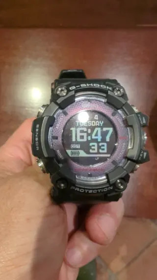 Reloj Casio G-Shock Rangeman con protección.Cristal de zafiro. Pantalla de tita electrónica. Solar. Tapa trasera de cerámica. Perfecto estado. - Resistente al agua WR 20BAR. - Pantalla con luz. - Correa negra.