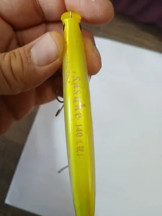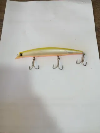 Señuelo de pesca Ima Sasuke 140, modelo original. - Diseño alargado y estilizado. - Acabado perlado con tonos amarillos y rosados. - Equipado con tres anzuelos triples.