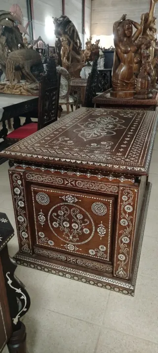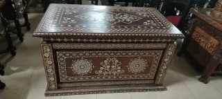 Espectacular arca de madera con un diseño intrincado de incrustaciones de nácar. Presenta motivos florales y geométricos. - Elaborada en madera - Detalles con incrustaciones de nácar. - Diseño tradicional.