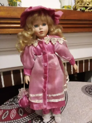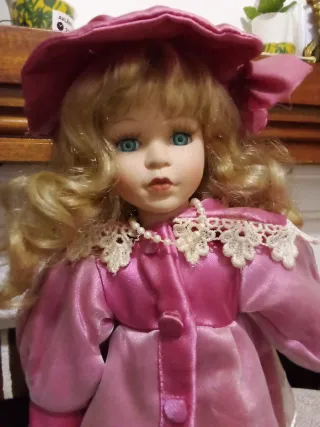 Preciosa muñeca de porcelana de 40cm. - Vestido rosa satinado con detalles de encaje. - Incluye sombrero a juego y bolso. - Melena rubia y ojos azules.