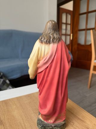Bonita estatua del Sagrado Corazón de Jesús, ideal para devoción o decoración. - Representación detallada de Jesús. - Túnica en tonos rojos y crema. - Base con aspecto rocoso.