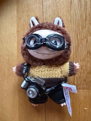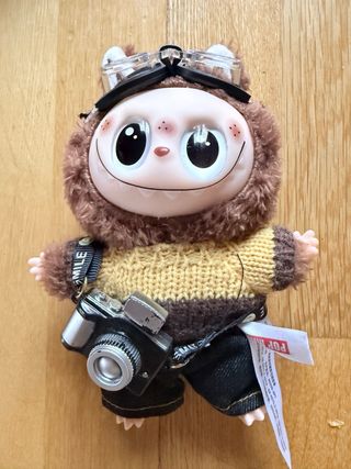 Figura Labubu con un divertido outfit de fotógrafo. Incluye gafas de buceo y una cámara. - Diseño de oso marrón con orejas. - Jersey de punto amarillo y marrón. - Pantalones vaqueros oscuros. - Es unos cm mas grande que los normales.