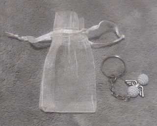 Llavero con un diseño de ángel delicado y hermoso. - Detalle de perlas blancas. - Alas plateadas. - Incluye una bolsita de organza blanca.