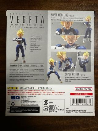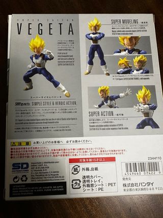 Figura de acción S.H.Figuarts de Vegeta en su transformación Super Saiyan. - Incluye cabezas intercambiables. - Manos intercambiables. - Diseño detallado de Tamashii Nations. - Nuevo, sin abrir
