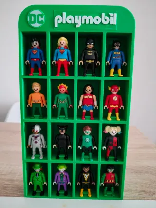 Completa colección de figuras de DC Comics de Kinder Sorpresa, presentadas en un expositor de Playmobil en color verde. - Figuras de personajes icónicos de DC. Colección completa, 16 figuras. - Incluye expositor temático de Playmobil.