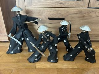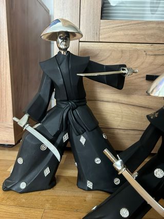 Conjunto de cuatro figuras decorativas de samuráis. - Cada figura viste un kimono negro con detalles plateados. - Portan espadas plateadas. - Los sombreros son de estilo cónico y plateados. La grande mide 30cm Las tres pequeñas 22cm