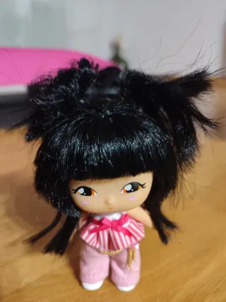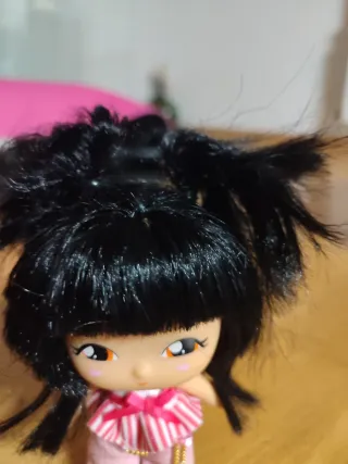 Muñeca Barriguita con pelo negro y traje rosa. - Pelo negro largo. - Traje a rayas rosas y blancas. - Pantalones rosas brillantes.