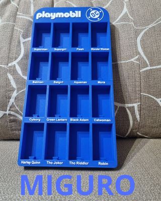 Expositor de coleccionismo para figuras de Playmobil de DC Comics. Ideal para organizar y exhibir tus personajes. - Diseño en color azul. - Compartimentos individuales para figuras. - Incluye nombres de personajes como Superman, Batman, Wonder Woman, Joker, entre otros.