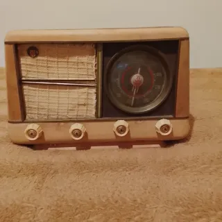 Radio antigua con un diseño clásico y elegante. - Carcasa de madera clara. - Dial circular con escala de frecuencias. - Altavoz cubierto con tela. - Cuatro botones de control frontales.