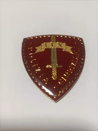 Placa metálica de la Polizia Giudiziaria de Italia. Polizia di Stato. - Diseño de escudo en color burdeos. - Inscripción LEX en una cinta dorada. - Espada y detalles en dorado.