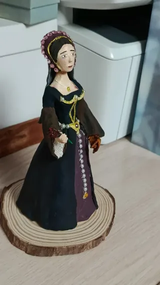 Figura decorativa de Ana Bolena, inspirada en la época Tudor. - Vestimenta detallada en tonos oscuros y morados. - Adornos dorados y perlas. - Sostenía una rosa roja y unos guantes. - Base de madera con diseño de rodaja.