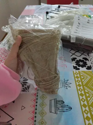 Conjunto de banderines de arpillera, perfectos para añadir un toque rústico a tus celebraciones. - Material: Arpillera. - Incluye cuerda para colgarlos.